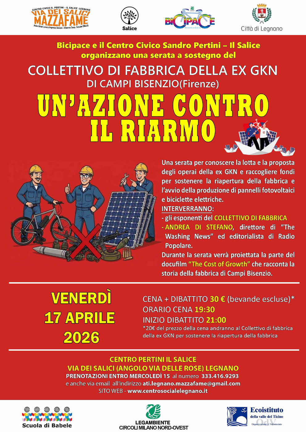 Incontro col collettivo di fabbrica ex GKN di Campi Bisenzio, a sostegno della loro proposta contro Il riarmo e di riconversione per produrre pannelli fotovoltaici e bici elettriche . Interverrร Andrea Di Stefano direttore di The Washing News ed editorialista di Radio Popolare.