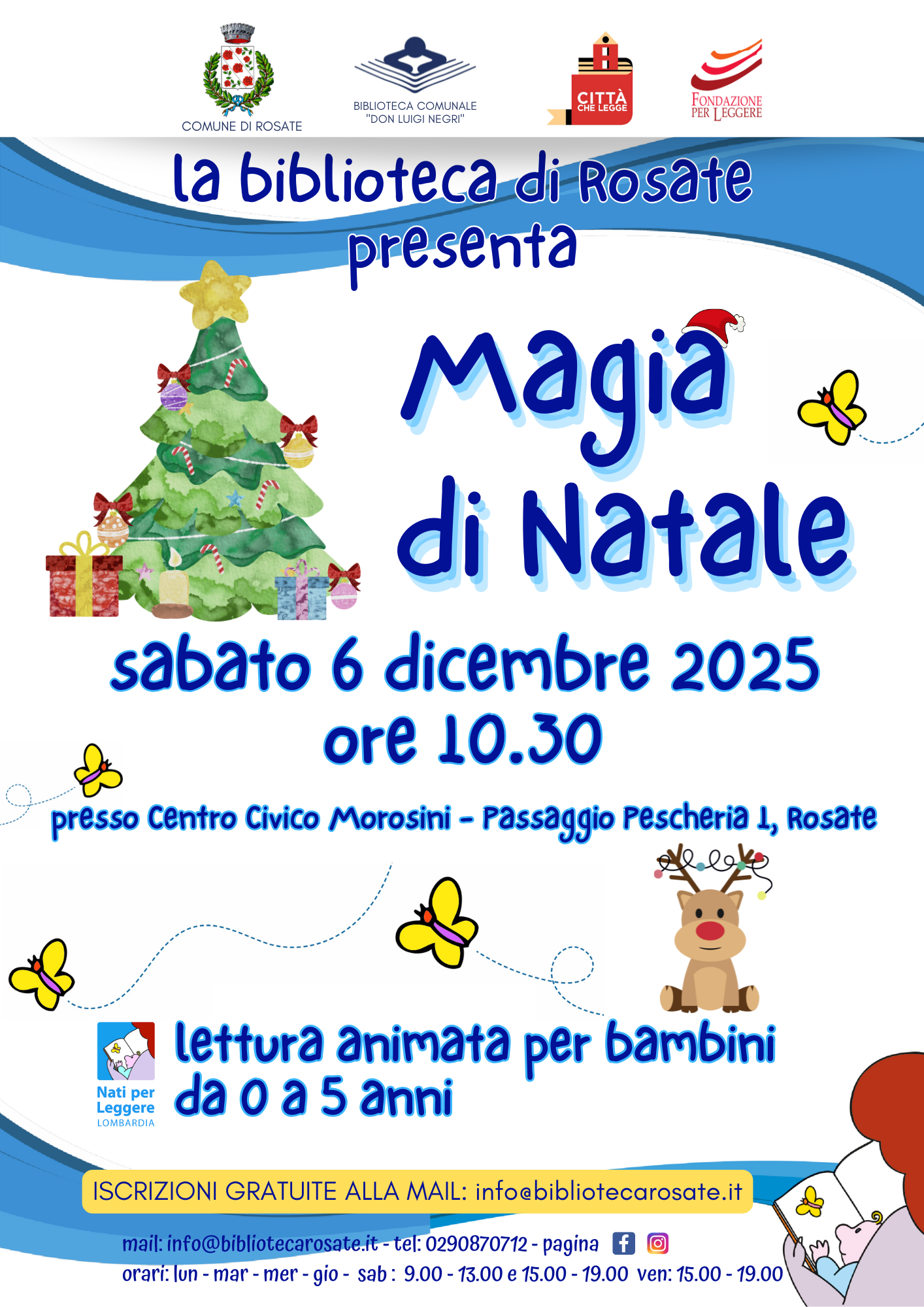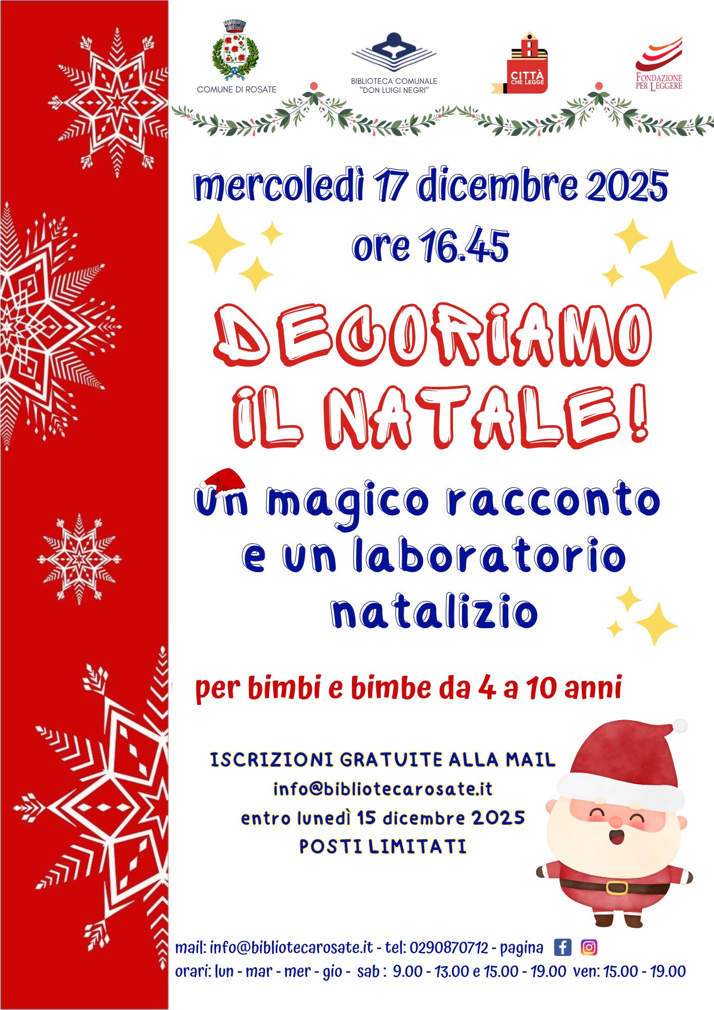 Appuntamento natalizio per bimbi e bimbe da 4 a10 anni. Magici racconti ed un laboratorio creativo per prepararci insieme al Natale! Info e iscrizioni gratuite alla mail info@bibliotecarosate.it