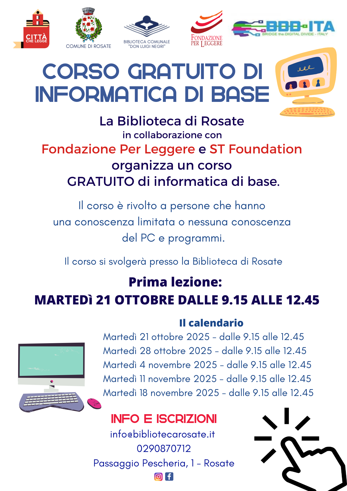 Ultimi posti per il corso gratuito di informatica di base per organizzato dalla biblioteca di Rosate in collaborazione con Fondazione Per Leggere e l’associazione ST Foundation! Il corso inizierà martedì 21 ottobre per 5 martedì dalle 9.15 alle 12.45 ed è rivolto a persone che hanno una conoscenza limitata o nulla del PC e dei programmi.
