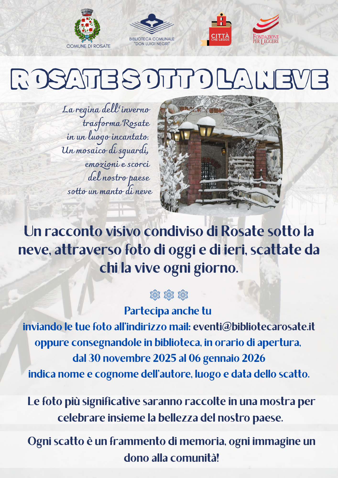 Partecipa anche tu inviando le tue foto di Rosate sotto il manto nevoso, all’indirizzo mail: eventi@biblioecarosate.it oppure consegnando i tuoi scatti in biblioteca, in orario di apertura, dal 30 novembre 2025 al 6 gennaio 2026; indica nome e cognome dell’autore, luogo e data della foto.
