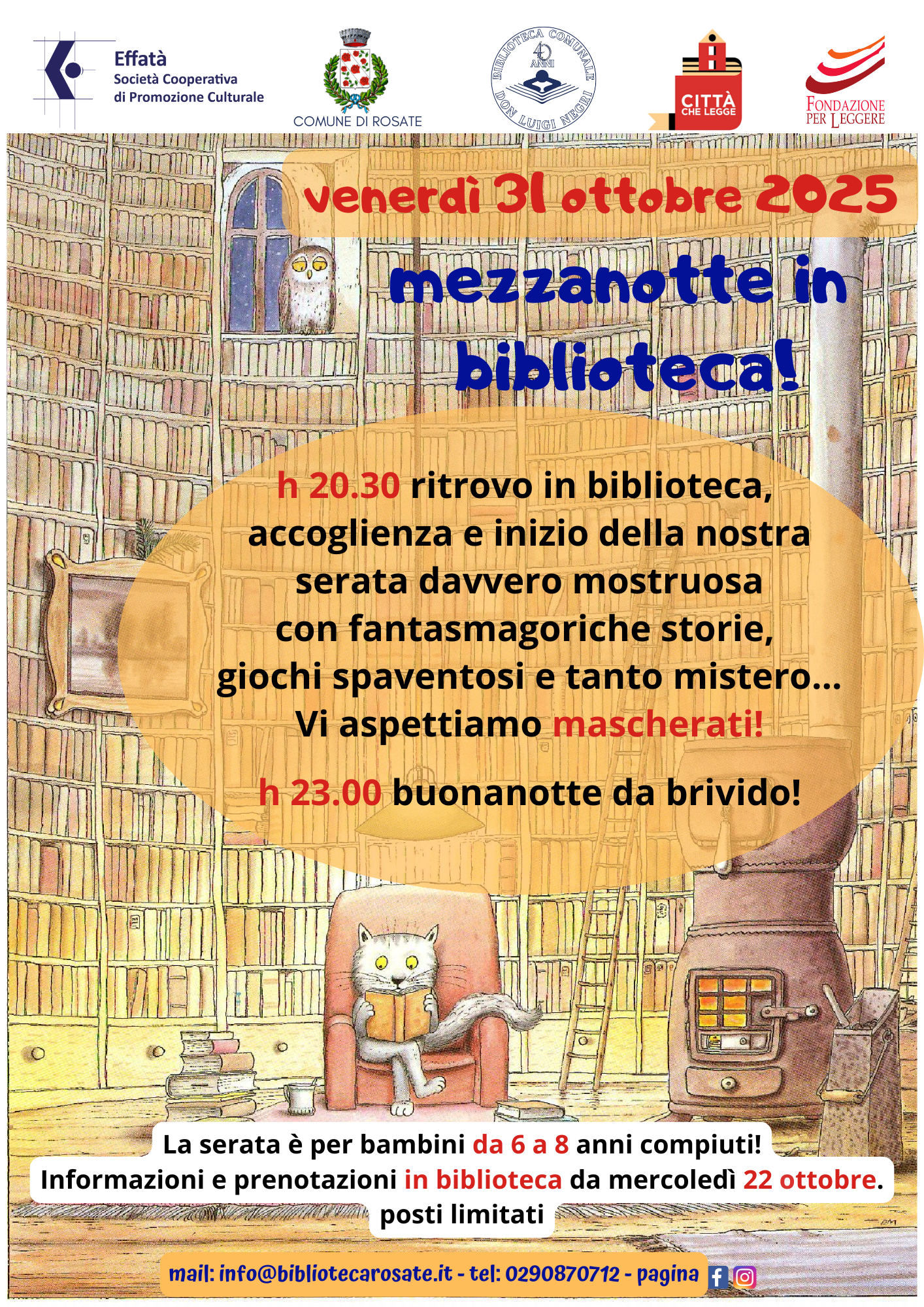 Venerdì 31 ottobre 2025 la biblioteca ospiterà bimbi/e coraggiosi! Aprirà eccezionalmente alle ore 20.30 tra fantasmagoriche storie, giochi spaventosi e tanto mistero… Ti senti pronto a passare con noi questa unica incantata serata biblioteca?
